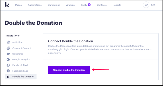 In the left-hand integrations menu, click Double the Donation.