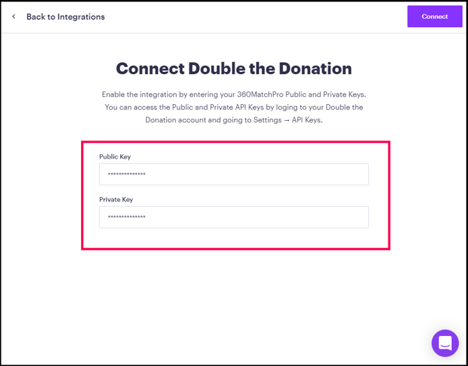 Paste your Public API Key and Private API Key from Double the Donation Matching → Settings → API Keys, then click Connect.