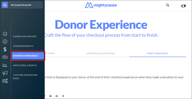 Click Donor Experience to customize the donor checkout journey.