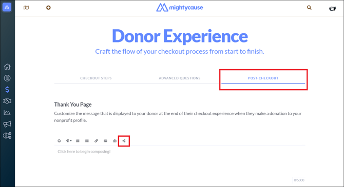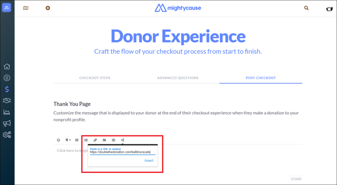 Choose the Post-Checkout tab to edit what donors see after submitting their donation, then click the Embed URL icon.
