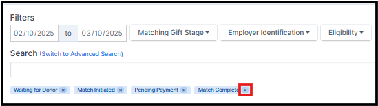 Within the Donations tab, you can filter donation records to narrow your view to only the data relevant to your workflow. The Filters bar allows you to filter by: