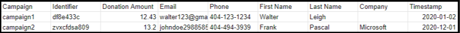 Campaign | ✔ | Use your campaign name. If you don’t segment by campaign, reuse the same name. | Spring Appeal |