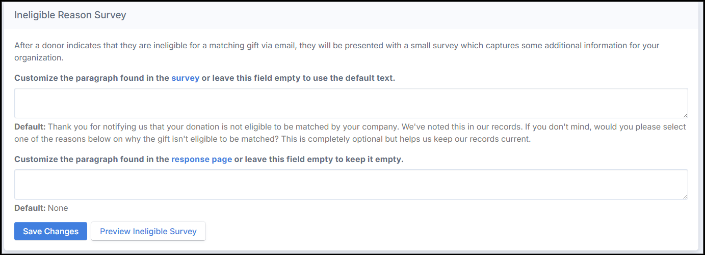 This message displays immediately after a donor submits their survey response. By default, this field is blank unless customized.