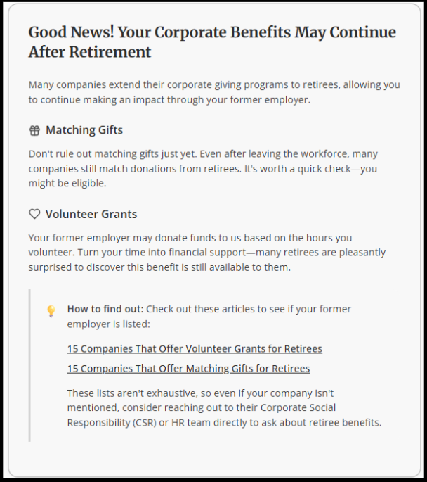 Matching gift programs for retirees