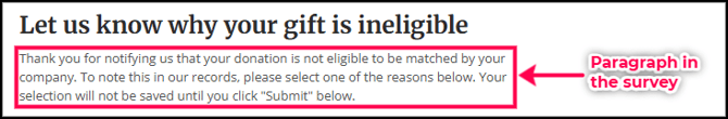 When a donor submits the Ineligible Reason Survey, Double the Donation displays tailored confirmation messaging.