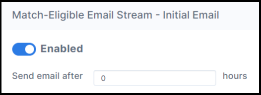 Example: If the initial send time for your Match-Eligible stream is set to 0 hours, selected donors from the CSV will receive an email immediately after import. (Screenshot on page 1 shows the stream Enabled with “Send email after: 0 hours.”)