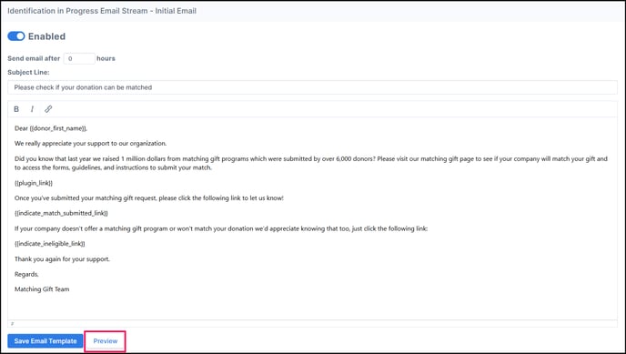 We recommend enabling the Identification In Progress automated outreach and using both of the two emails in this stream for maximum engagement with your donors. Click here to learn more about our recommendations for automated outreach in the matching module.