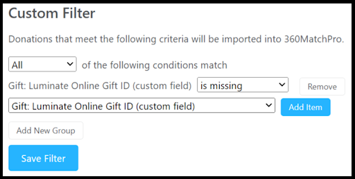 A: You can set a custom filter so only non-Luminate records are imported from RE-NXT. Following the instructions here, set a filter for “Gift: Luminate Online Gift ID (custom field)” which is missing. The following filter should then be visible in your matching module under Integrations → Manage: