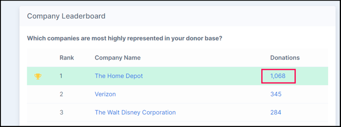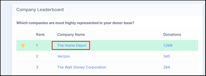 The Company Leaderboard shows a ranked list of companies that are most represented by your donors.