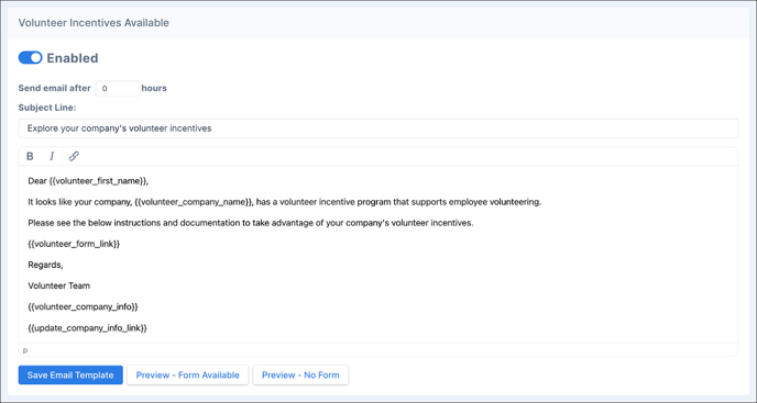 This email stream sends emails to volunteers identified as working for companies offering corporate volunteer incentives. There are three available email templates in the “Volunteer Incentives Available” stream: