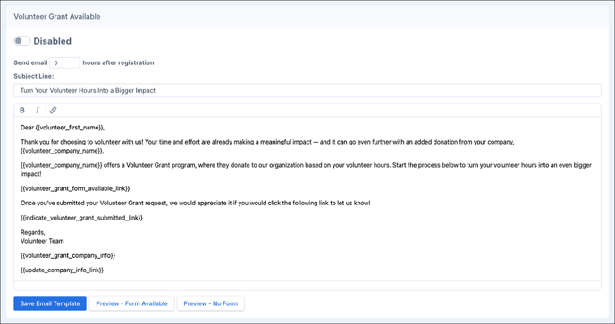 When enabled, this triggers an email when there’s an available Volunteer Grant for a volunteer.