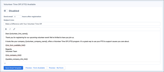 When enabled, this triggers an email when there’s an available Volunteer Time Off (VTO) for a volunteer.