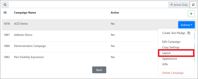 Navigate to the PledgeCart campaign where you want to add the matching gift search tool.