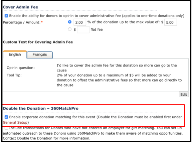 Scroll to the Double the Donation Matching section and check: Enable corporate donation matching