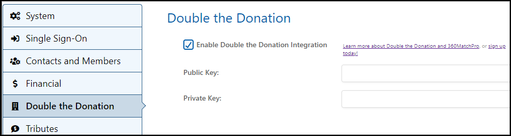 Enter your Public Key and Private Key from your Double the Donation Matching portal.