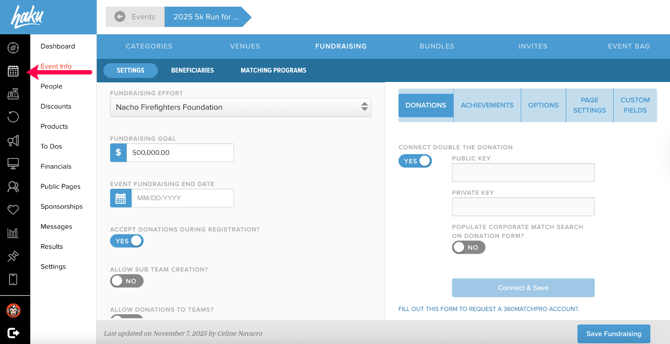 Step #3: Go to the Event Info tab, and in the top banner, click on the Fundraising tab.
