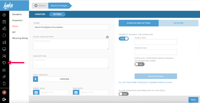 A: Yes! Navigate to your desired donation form builders (called "Efforts" in Haku) to add or remove Double the Donation Matching functionality.