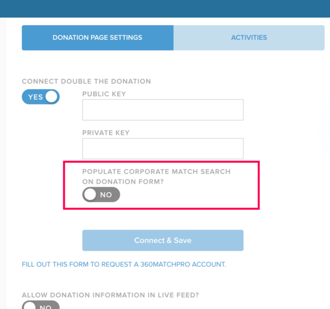 Step #4: Scroll down the page, and on the right-hand side, toggle the “Connect Double the Donation” switch to YES. Enter your public and private keys in the appropriate fields, then click Connect and Save.