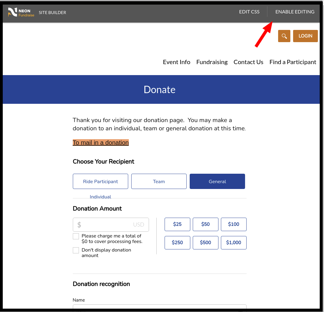 Note: Integration changes made to the standard donation forms are automatically applied to the lightbox pop up window on personal pages if an organization has this pop up window enabled. For instructions on how to enable the lightbox pop up window for personal pages, see the bottom of this article.
