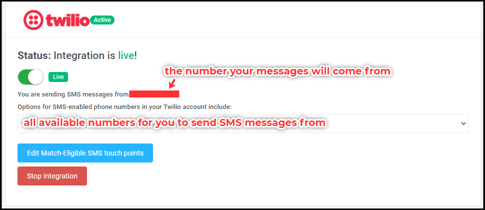 Use the dropdown menu to select the specific SMS-enabled phone number you want your automated messages to come from.