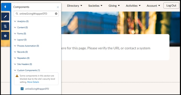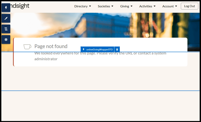 Step 2. Delete the onlineGivingWrapper component by hovering over the component and clicking the trash can icon.
