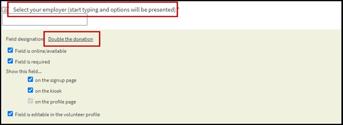 ✓ The Double the Donation employer search now appears on the selected registration form.