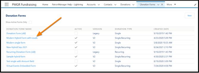 Select the V2 Donation Form you want to update.