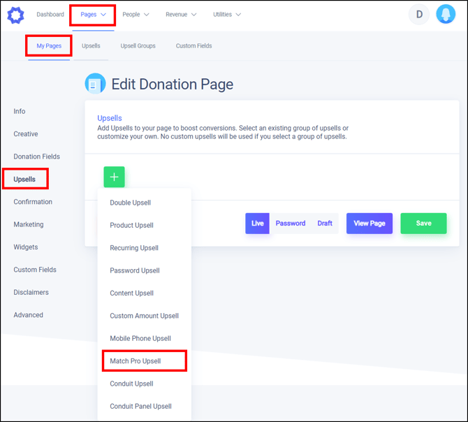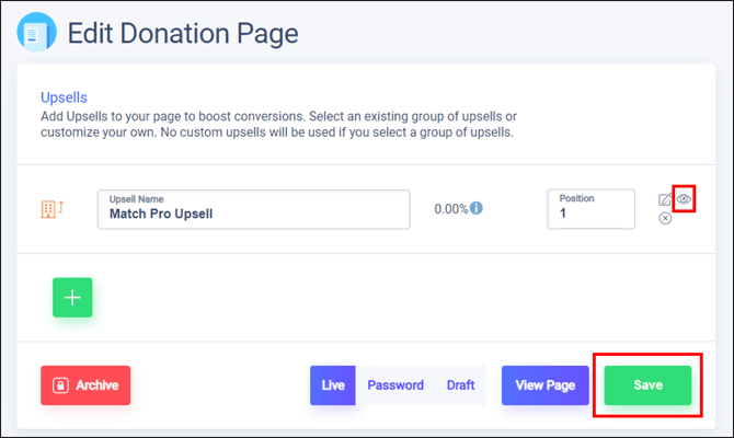 Click Save, then select the eye icon to preview how the matching gift upsell appears to donors.
